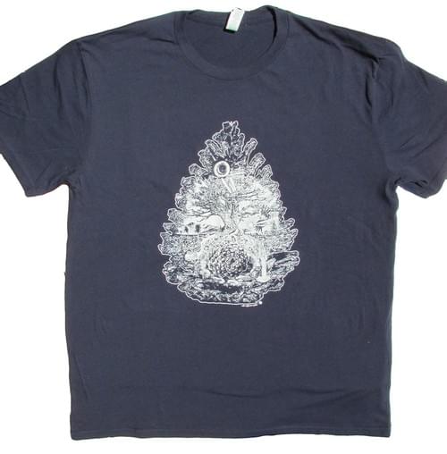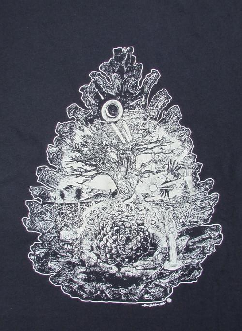 Original "Cosmic Pinecone" woodblock print design by Demian Bartholomew-Keller screenprinted on 100% organic cotton tshirt.